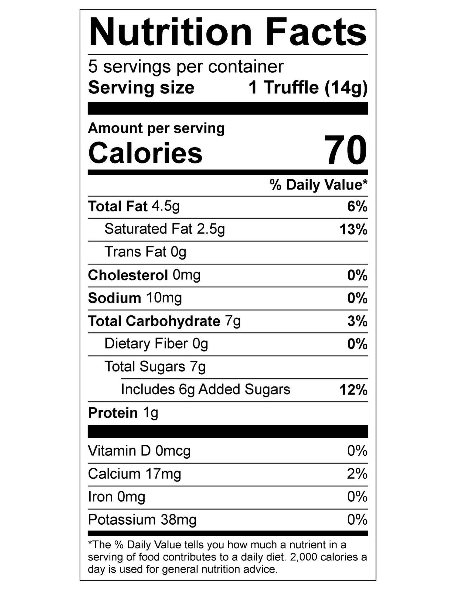 Nutrition Facts: Servings per container 5, Serving Size 1 Truffle (14g), Amount Per Serving: Calories 70, Total Fat 4.5g (7% DV), Saturated Fat 2.7g (14% DV), Trans Fat 0g, Cholesterol 2mg (1% DV), Sodium 10mg (0% DV), Total Carbohydrates 7g (2% DV), Fiber 0g (0% DV), Total Sugars 7g (Including 6g Added Sugars, 12% DV), Protein 1g, Vitamin D (0% DV), Calcium 17mg (15% DV), Iron 0mg (0% DV), Potassium 38mg (40% DV)