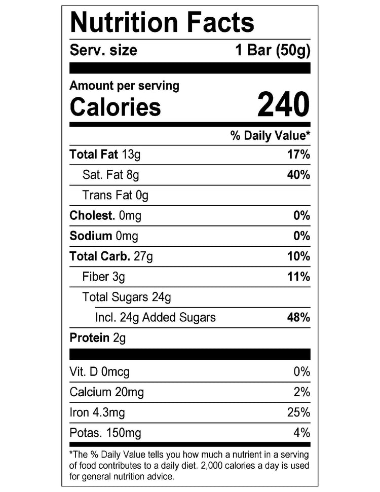 Servings: 1, Serv. Size 1 Bar (50g), Amount Per Serving: Calories 260, Total Fat 15g (23% DV), Saturated Fat 9.8g (49% DV), Trans Fat 0g, Cholest. 10mg (3% DV), Sodium 30mg (1% DV), Total Carb. 29g (10% DV), Fiber 1g (4% DV), Total Sugars 28g (Incl. 25g Added Sugars, 50% DV), Protein 3g, Vit. D (0% DV), Calcium (8% DV), Iron (6% DV), Potas. (4% DV).