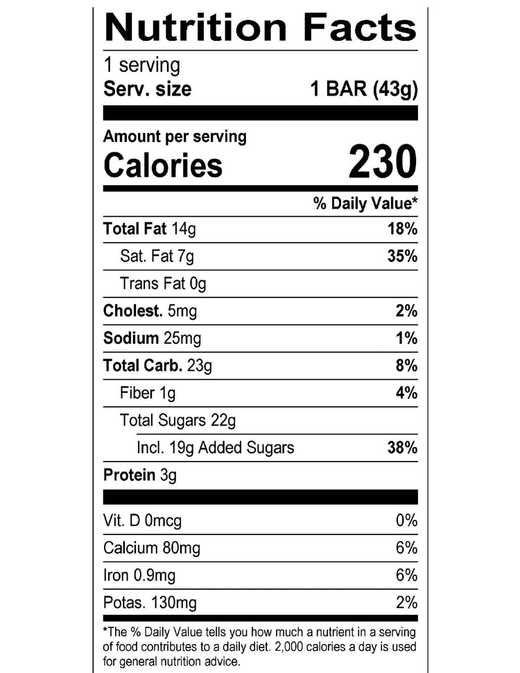 Nutrition Facts Servings: 1, Serv. Size 1 Bar (50g), Amount Per Serving: Calories 270, Total Fat 16g (25% DV), Saturated Fat 8.4g (42% DV), Trans Fat 0g, Cholest. 10mg (3% DV), Sodium 30mg (1% DV), Total Carb. 28g (9% DV), Fiber 2g (8% DV), Total Sugars 25g (Incl. 23g Added Sugars, 46% DV), Protein 4g, Vit. D (0% DV), Calcium (10% DV), Iron (6% DV), Potas. (4% DV).