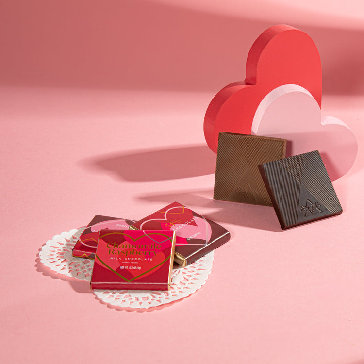 Our Valentine's Day Squares are love at first sight! Enjoy an 18pc assortment of our Chamomile Raspberry Milk Chocolate & 54% Dark Chocolate V-day squares! Each square is sleeve-wrapped in a lovely Valentine's-themed design.