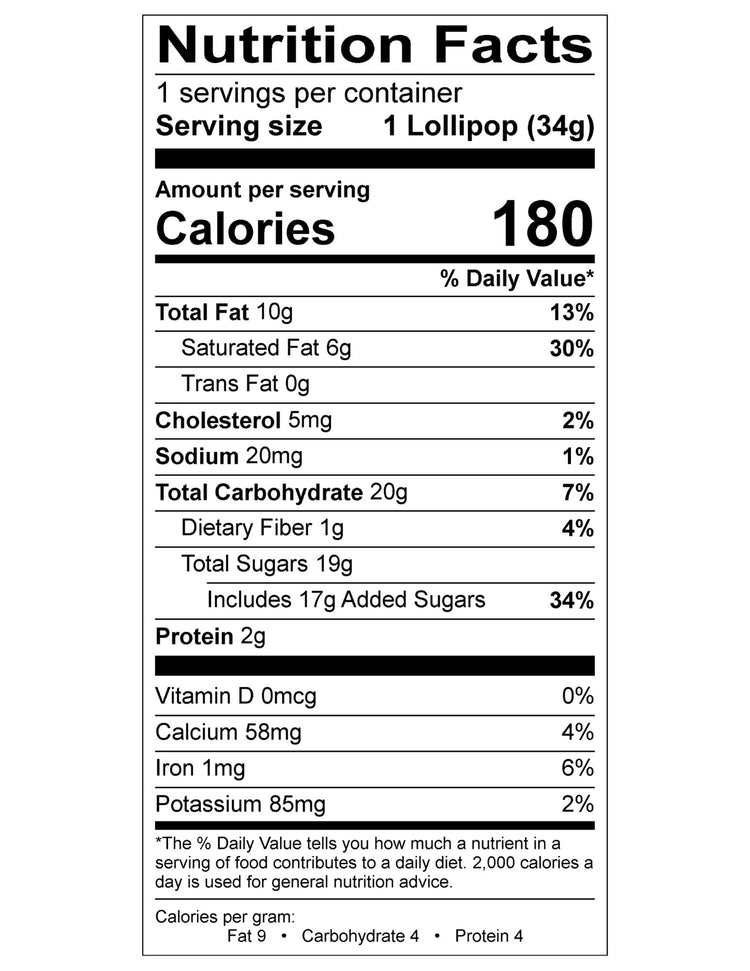 Nutrition Facts Servings: 1, Serv. Size 1 Lollipop (34g), Amount Per Serving: Calories 180, Total Fat 10g (15% DV), Saturated Fat 6.2g (31% DV), Trans Fat 0g, Cholest. 5mg (2% DV), Sodium 20mg (1% DV), Total Carb. 20g (7% DV), Fiber 1g (4% DV), Total Sugars 19g (Incl. 17g Added Sugars, 34% DV), Protein 2g, Vit. D (0% DV), Calcium (6% DV), Iron (4% DV), Potas. (2% DV).