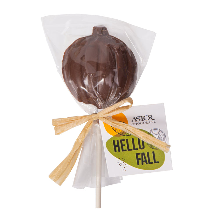 Creamy milk chocolate pumpkin lollipop wrapped in a cello bag with twist-tied raffia kraft ribbon and a "Hello Fall" hang tag!