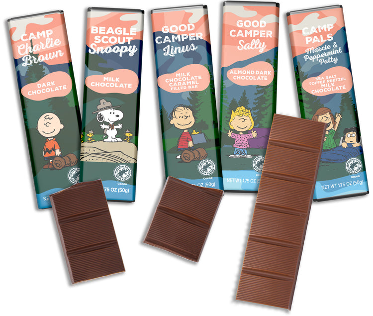 Our Camp Snoopy Assorted 5 Bar Pack contains the following bar flavors: 1.5oz Almond Dark Chocolate, 1.5oz Sea Salt Toffee Pretzel, 1.75oz Milk Chocolate Caramel, 1.5oz Milk Chocolate, and 1.5oz Dark Chocolate.