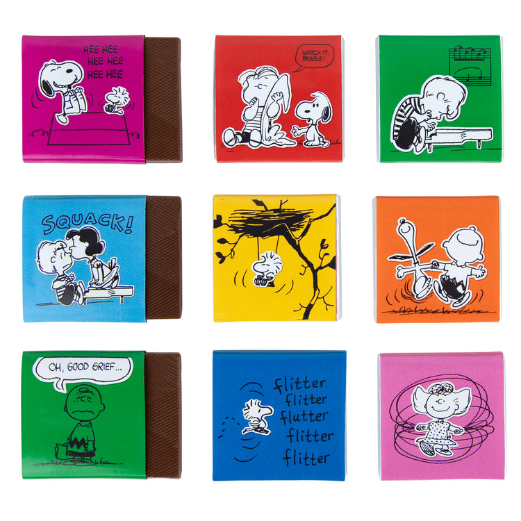 The Gang's All Here! Join the Peanuts® crew with our 9 Piece Chocolate Square Tiles with creamy and rich milk chocolate, with assorted wrapping! These squares are sure to put a smile on your face!