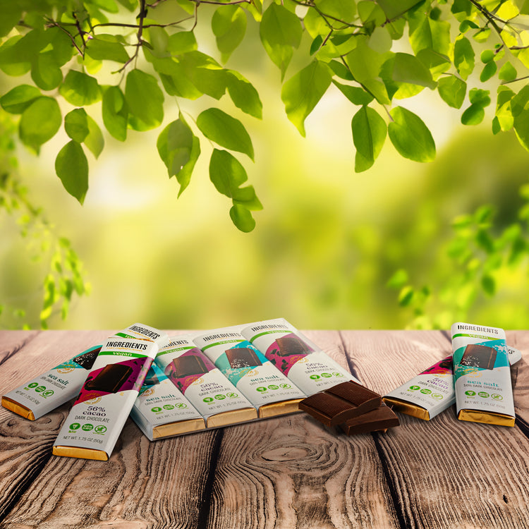 Our Ingredients Vegan 4-Bar Pack with chef crafted flavors are the perfect dark chocolate bars for those that are dairy-free and want to enjoy something sweet & decadent! Pack flavors include: Sea Salt 56% Dark Chocolate, 56% Cacao Dark Chocolate, Sea Salt 56% Dark Chocolate, and 56% Cacao Dark Chocolate. These make the perfect treat!