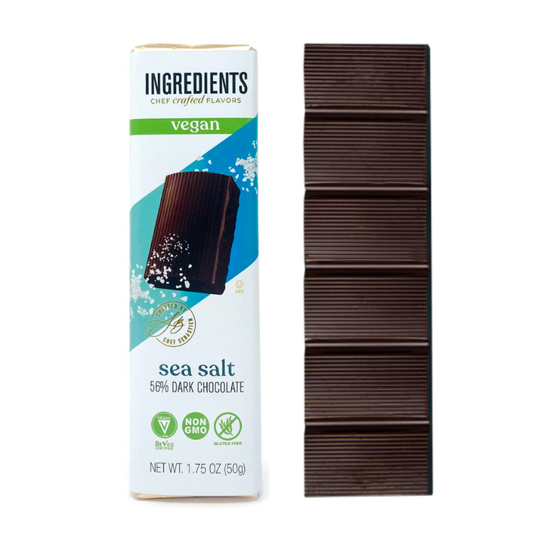 Dark chocolate (chocolate liquor, sugar, cocoa butter, soy lecithin, vanilla extract), sea salt. Contains: Soy. May contain milk, wheat, peanuts, and tree nuts.